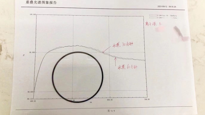 ZX1550機(jī),中興V300-10A霍爾離子源冷鍍,節(jié)拍33min/爐,水煮30min、60min,基片無(wú)脫膜,無(wú)泛黃,曲線整體無(wú)漂移